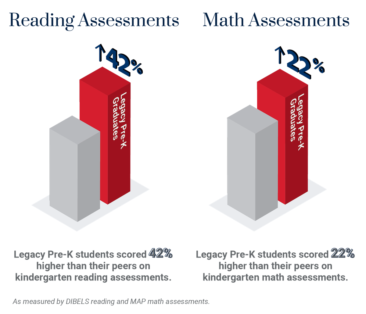 In the 2023-24 academic year, our Kindergarten graduates showcased their advanced literacy and mathematics skills through exceptional performance in key kindergarten assessments. The Dynamic Indicators of Basic Early Literacy Skills (DIBELS) reading assessment measures critical early reading skills, while the Measures of Academic Progress (MAP) assesses proficiency in mathematics. Kindergarten students who attended Legacy Pre-Kindergarten outperformed their peers by over 20 percentile points in DIBELS and by more than ten percentile points in MAP math assessments!
